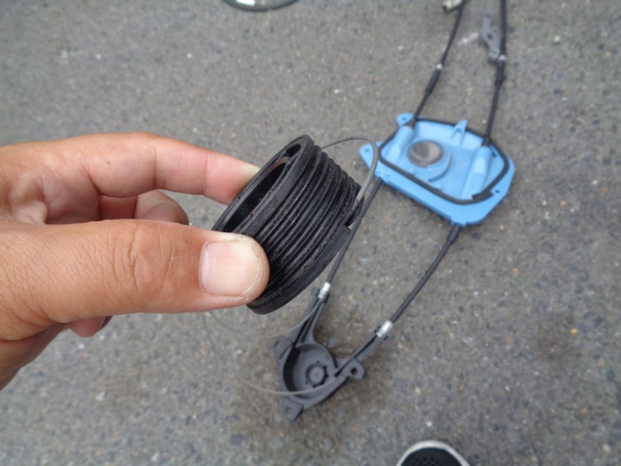 剥けた被覆が巻き取り滑車の溝に詰まり、ワイヤーが絡まって動かなくなると