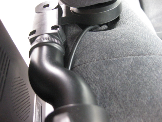 モニターに繋がっている配線を隠すのに一苦労です!!ヘッドレスト台座脇からシートの中へ配線を通します。