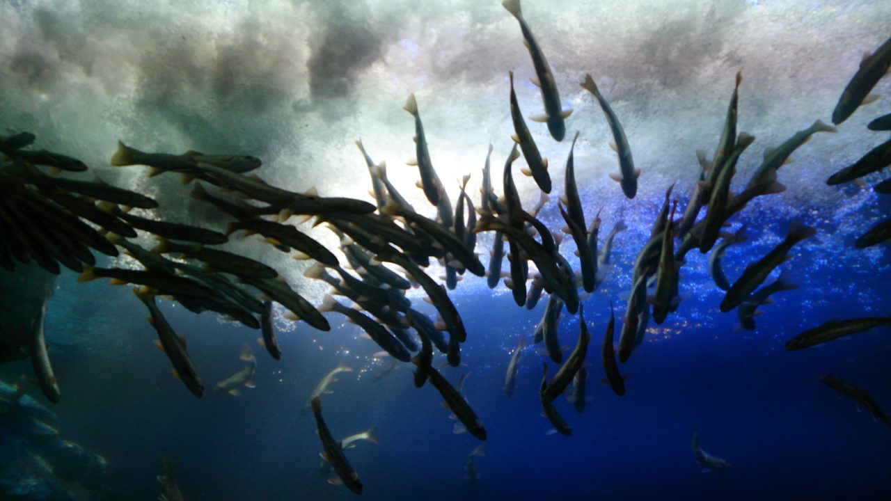 水族館で目面しい光景が、、、、、、、、、、、、下からヤマメ!!
